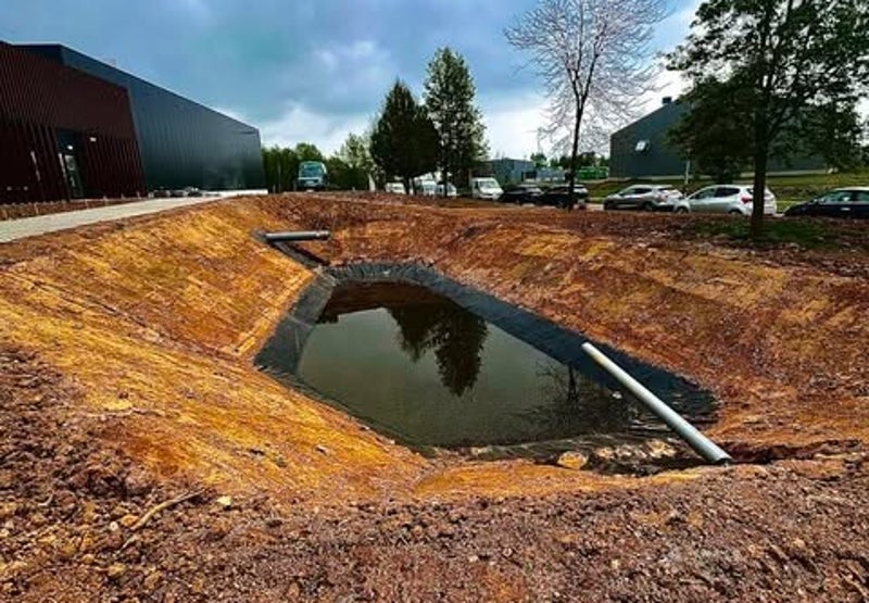 Bassin de rétention en cours d'aménagement, conçu pour une gestion durable des eaux pluviales dans un environnement urbain.